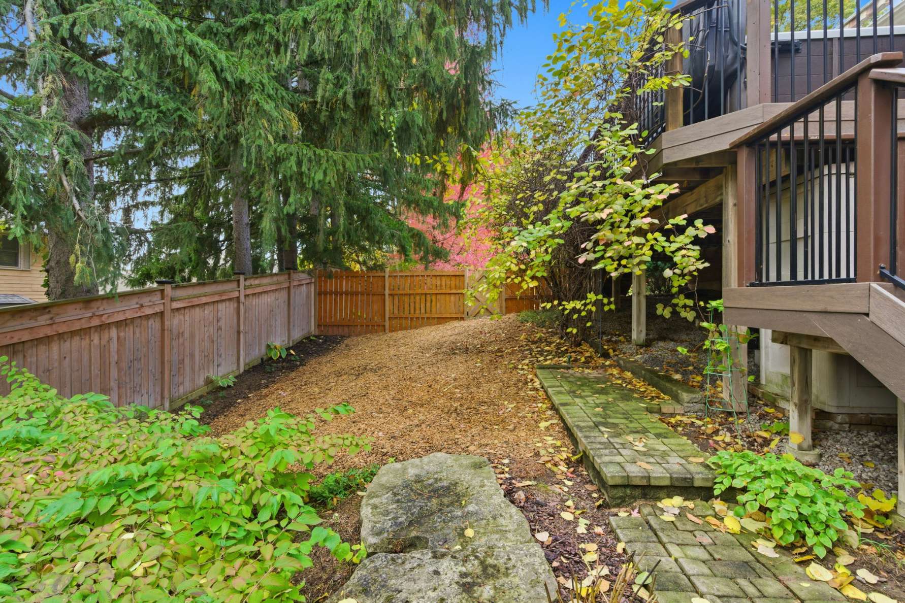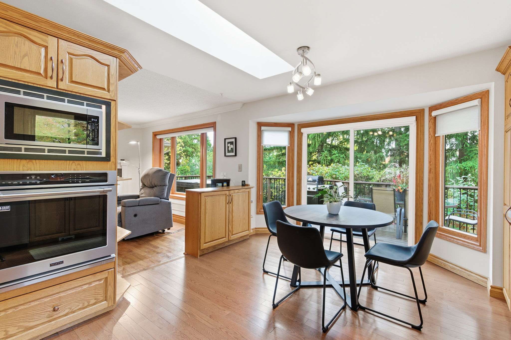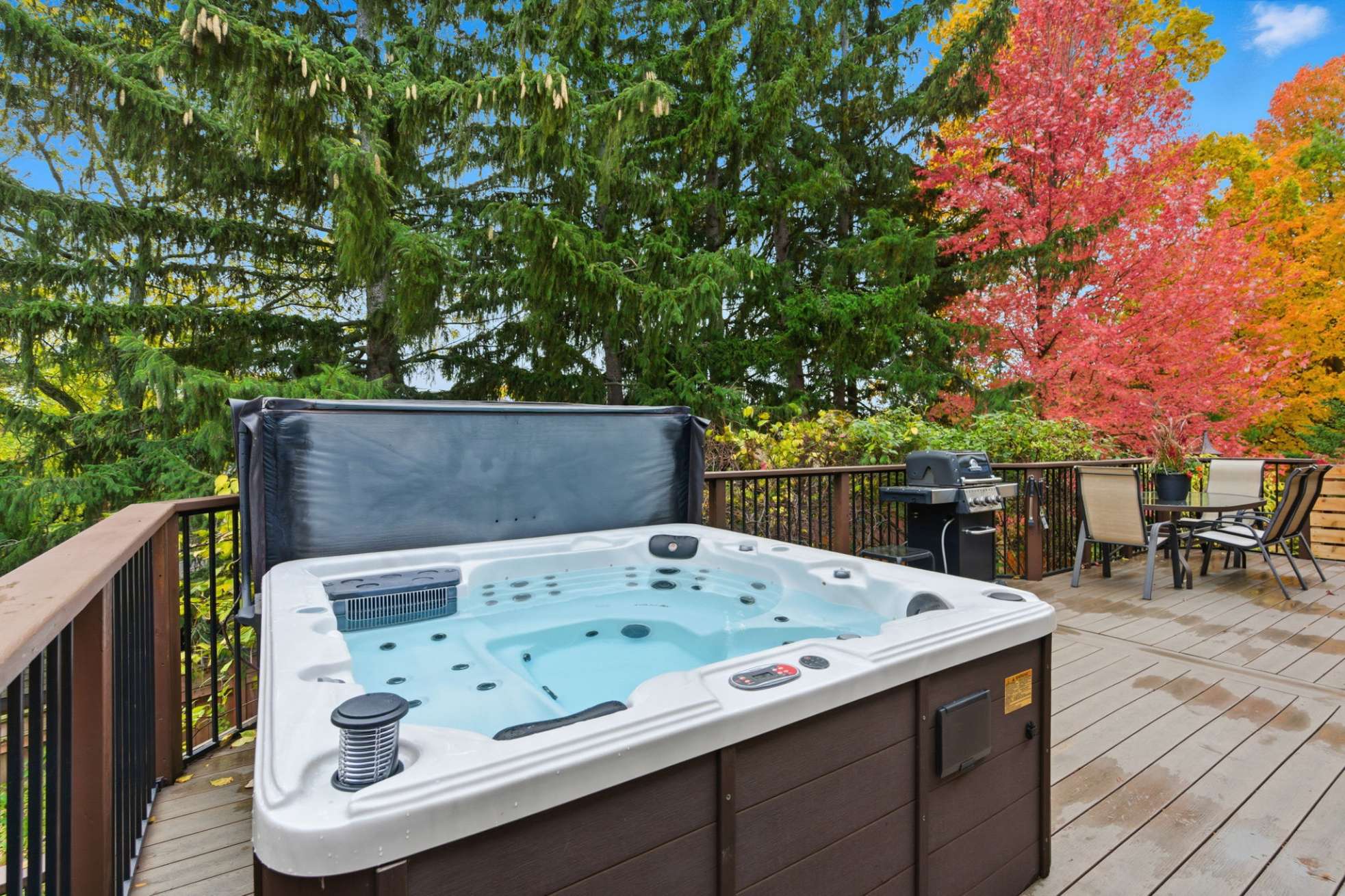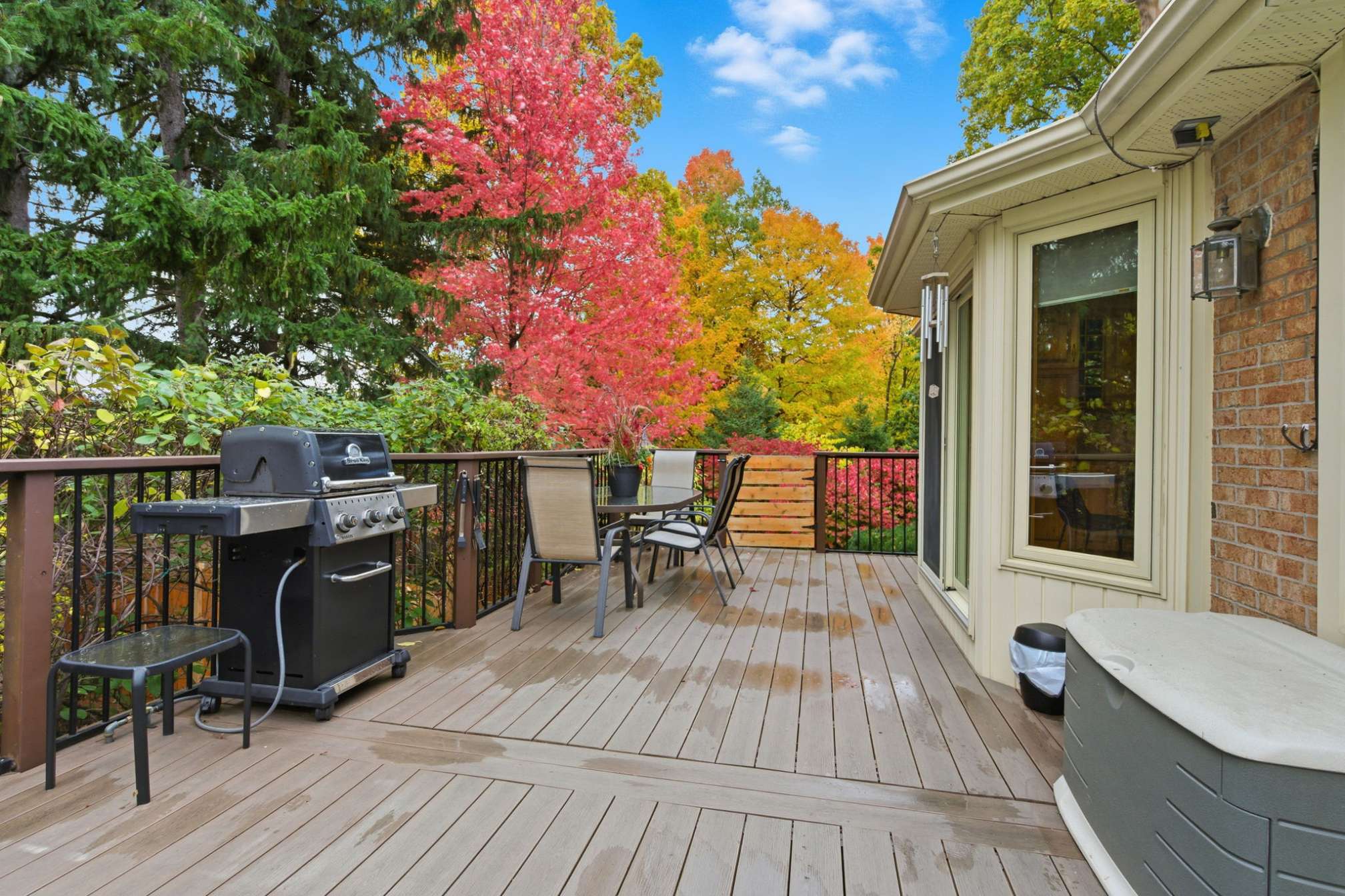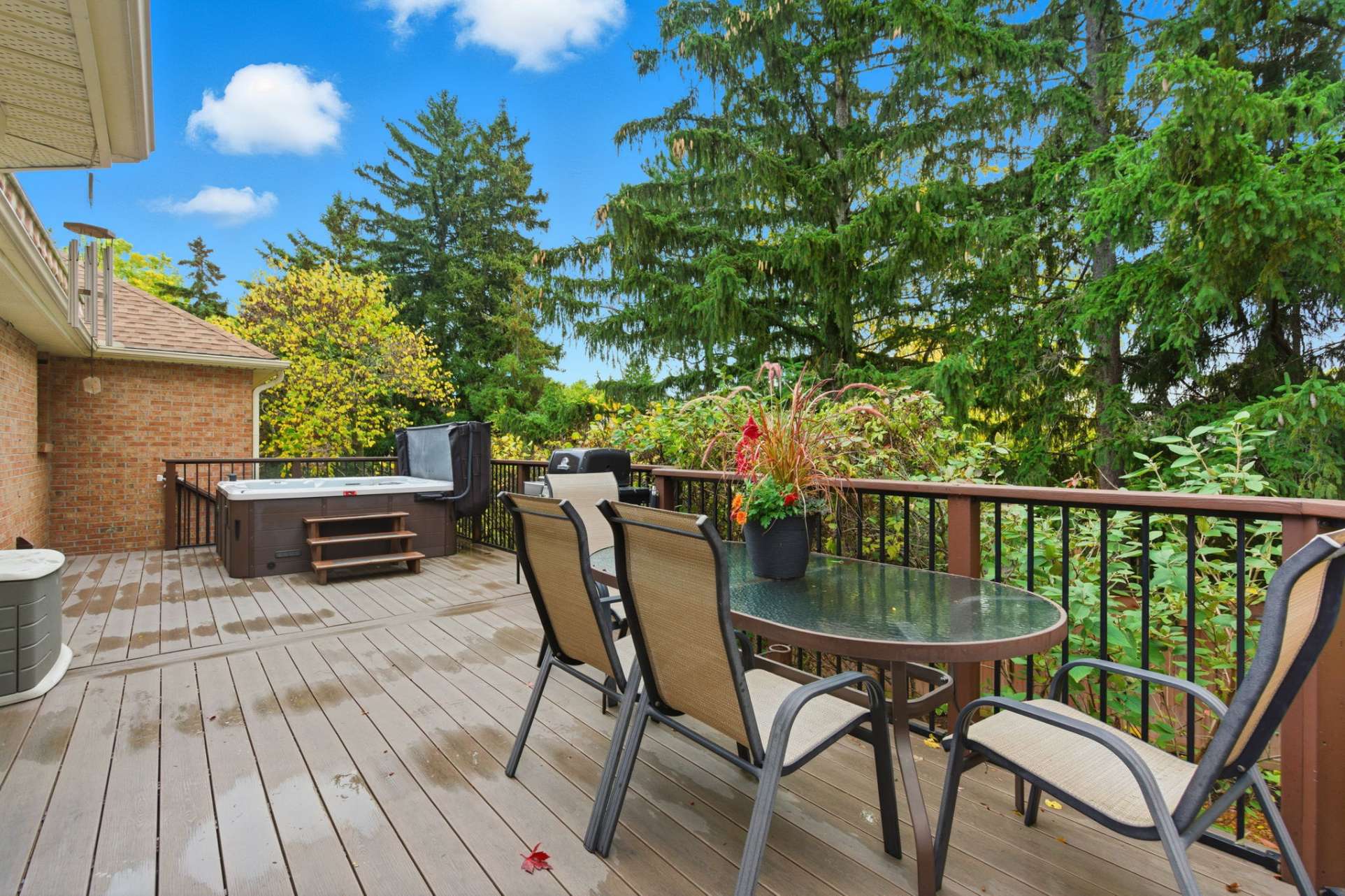The open-concept layout seamlessly connects the family room and eat-in kitchen, creating a warm and inviting flow for everyday living and gatherings. Step out onto the deck, unwind in your hot tub, and enjoy a glass of wine while taking in the serenity of your surroundings.